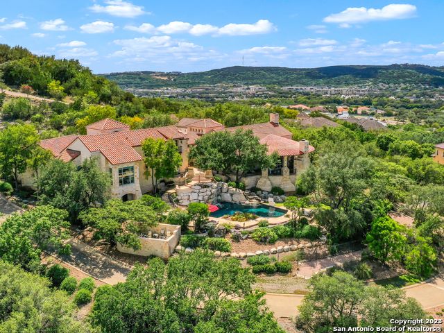 Unparalleled craftsmanship! Located on a 2.35+- acre hillside lot this perfectly situated home relishes the awe inspiring 180+ degree Texas Hill Country views from every room! This architecturally significant Dominion home is one-of-a-kind, and was designed by renowned architect, Roy Braswell, and built by master builder, Image Custom Homes. The finest appointments throughout are fit for the most discerning buyer. Grandeur open living space is appointed with vaulted ceiling, floor to ceiling stone fireplace and opens to dining room with doors opening to expansive covered patio. Entertainers dream kitchen with Sub Zero appliances, custom cabinetry, and large center island with breakfast bar, is adjoined by wet bar and separate caterers' kitchen with extensive storage and secondary dishwasher. Primary suite offers outdoor access with its own covered patio and generous ensuite bath boasting natural stone elements, multiple vanities, built-ins, two closets, and soaking tub overlooking serene private yard. 3 secondary bedrooms are on the first floor, each with their own ensuite bath and breathtaking views. Spiral staircase leads down to entertainment level with game room, bar, full bath, and pool access. Impressive deep-water Keith Zars pool offers spa, multiple water features, diving ledge, and pristine flagstone decking providing ample poolside living space. Private drive, motor court, and three car garage provide ample room for all your toys.