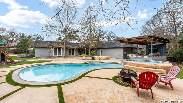 Tucked away on the largest lot in Whispering Oaks and backing directly to a serene greenbelt, 11510 Whisper Circle offers exceptional privacy, thoughtful upgrades and refined indoor outdoor living. This 2,756 square foot residence features four bedrooms and three fully renovated bathrooms with added soundproofing around every bedroom for enhanced comfort and tranquility. At the heart of the home is a true chef's kitchen equipped with a gas range, Sub-Zero refrigerator/freezer and custom counters that extend six inches deeper than standard providing generous prep space and storage. The entire home has been replumbed with PEX and all windows have been replaced, offering peace of mind and modern efficiency. Step outside to a private backyard retreat featuring a pool and spa, plus a well-appointed cabana complete with built-in grill and ceramic smoker grill, ideal for entertaining or quiet evenings at home. The home's unique positioning next to the greenbelt creates a secluded, natural setting while remaining part of one of San Antonio's most well established neighborhoods, Whispering Oaks. Meticulously maintained, landscaped and extensively updated, this property combines luxury, privacy and smart design.