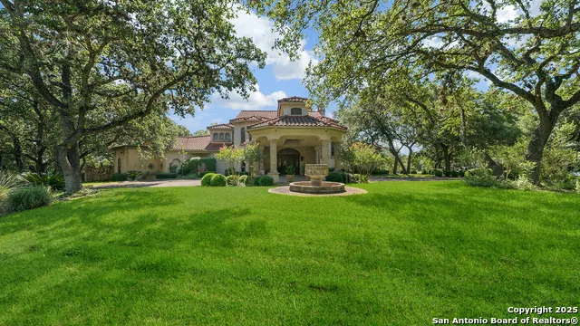 Set along one of Elm Creek's most distinguished streets, this extraordinary home is one of only two true custom-built residences in the entire community-offering a level of craftsmanship and architectural distinction that sets it apart. From the moment you arrive, the cantera stone driveway and dramatic port cochere make a lasting impression. Multiple cantera stone columns, both inside and out, add a timeless, grand feel throughout the property. Inside, a soaring two-story foyer welcomes you with rich marble floors, coffered ceilings, and detailed crown molding-setting the stage for elegant living and entertaining. The open-concept design includes a spectacular built-in bar and flows seamlessly into the living and dining areas-perfect for gatherings large or small. The chef's kitchen is a showstopper, featuring contrasting custom cabinetry, gleaming white countertops, and a full suite of stainless steel appliances designed for both beauty and function. Downstairs, you'll find three spacious en suite bedrooms, including a private primary suite with its own sitting area and access to the outdoors. The spa-like bath pampers with dual vanities and a deep soaking tub. Upstairs, a cozy game room with a fireplace opens to an oversized covered balcony-ideal for relaxing evenings. Tucked away on the second level is a hidden gem: an L-shaped cedar-lined closet with built-in gun shelving and ample storage, offering discreet, secure organization with a custom touch. Other highlights include a covered patio for outdoor entertaining, a spacious three-car garage, and thoughtful details throughout that reflect the care and artistry of true custom construction. This is more than a home-it's a rare opportunity to own a statement property in one of San Antonio's most established and sought-after neighborhoods.