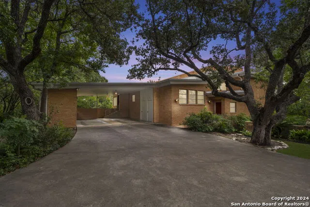 Nestled in the heart of a coveted neighborhood, this mid-century masterpiece at 138 Mount Erin Pass offers a unique blend of timeless design and modern living. Set on over an acre, the property is surrounded by mature live oak trees, providing shade and privacy while creating a tranquil oasis just minutes from vibrant city life. Originally built in 1960 and designed by renowned architect Frost W. Carvel, the estate boasts a classic split-level layout that harmonizes seamlessly with its natural surroundings. Approaching the home, its hilltop location offers a breathtaking view of the downtown skyline. Upon entering, meticulously preserved original details evoke the elegance of the era. The expansive living room, bathed in natural light from clerestory windows, centers around a dramatic brick fireplace with an extended hearth, perfect for cozy evenings. Sliding glass doors lead to the raised patio-a prime spot to take in the uninterrupted downtown views. The primary suite, located on the top floor, opens onto the same patio, offering a serene retreat. Featuring large closets, hardwood floors concealed beneath carpeting, and a walk-in shower in the en-suite ADA-compliant bath, this bedroom is both luxurious and inviting. A nearby study, adorned with cherry wood paneling and cork flooring, includes a wet bar-ideal for entertaining or creating a quiet escape. The mid-level of the home is designed for both casual living and formal gatherings. The kitchen, complete with an island cooktop and double ovens, offers ample space for culinary enthusiasts, while the adjacent breakfast room provides picturesque views of the lush backyard. Exposed beams and terrazzo tile floors in the formal dining room add sophistication, making this home the ultimate entertainer's paradise. On the lower level, two oversized guest bedrooms-each with spacious walk-in closets-offer comfort and privacy. The second living room on this floor, which could serve as a fourth bedroom, features an exposed brick wall, custom built-in bookcases, and two large walk-in closets, adding charm and character. Outside, the expansive yard offers endless possibilities for creating your dream outdoor retreat, including prime locations for a future pool or sports court. One of the home's most striking features is its walk-up rooftop deck. Here, 360-degree views of the surrounding landscape and downtown skyline create an unforgettable experience-ideal for enjoying quiet sunsets or simply admiring the scenery. With abundant storage throughout and architectural details that are both timeless and rare, this home is a true mid-century gem, awaiting its next chapter. From the expansive rooftop views to the peaceful, tree-lined grounds, 138 Mount Erin Pass is more than just a home-it's a lifestyle, a sanctuary, and an opportunity to own a piece of history.