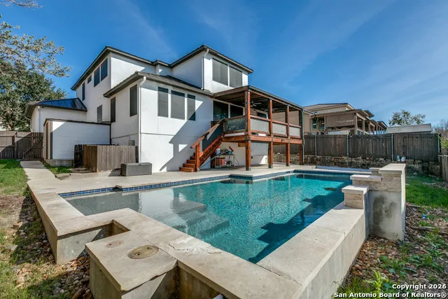 Welcome to this remodeled Spanish Mediterranean-style home located in the desired-able 1604! The property features a custom deck surrounded by extensive concrete work with a custom in ground pool creating the perfect outdoor retreat. Stepping inside, you will see the custom-built San Marcos steel front door leading to the bright interior enhanced LED lighting throughout the home and the long wood plank tile. The home showcases Brazilian quartz countertops with custom 36- inch cabinets & gas stove.