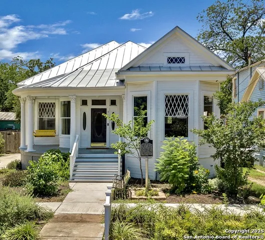As indicated on the Texas Historical (THC) plaque that celebrates the home, accomplished violinist and composer Silvestre Revueltas composed his Septet Batik at this very King William Historic Neighborhood residence. That same atmosphere of inspiration, which has resonated throughout time, continues to captivate all who enter the space. The elegant Corinthian columns provide an architectural distinction, while a unique and rare, rounded glass window pane captures your attention. The property features exceptional curb appeal, characterized by the owner's hand-tended flowers and plants, and a welcoming front porch that invites admiration, complete with a cheery yellow porch swing. The entryway and dining room are distinguished by their exquisite coffered wooden ceilings, which introduce yet another element of classic sophistication. The presence of a fireplace establishes a focal point in the parlor, which can also be considered an additional bedroom as it has a concealed closet, and the wood-paneled wall contributes warmth and invites comfort for intimate gatherings or cozy nights. A bright and inviting kitchen serves as the central heart of the home, equipped with modern appliances, ample counter space, a kitchen island, and charming details well-suited for both daily activities and hosting friends, neighbors, and family. The yard is low maintenance, complementing the urban lock-and-leave lifestyle the home affords. The overall aesthetic is enhanced by farmhouse-inspired elements, which are mainly found in the kitchen and include shiplap accents and vintage-style fixtures that foster a welcoming ambiance. The layout of the residence allows for flexible bedroom arrangements, accommodating various needs such as guest rooms, home offices, or creative spaces tailored to individual preferences. Rich hardwood floors extend throughout the home, mostly original, providing a perfect canvas for personalization. In the primary bathroom, a clawfoot tub offers an inviting option for relaxation. Additionally, practical storage solutions within the yard include aesthetically pleasing sheds for well-organized gardening equipment, ensuring an efficient workspace. Schedule your showing today to learn more, and perhaps you may be the next composer adding your own unique symphony to its storied past, as each room invites you to compose a new chapter in the melody of life.
