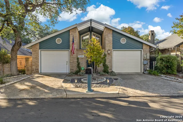 Charming and beautifully maintained garden home featuring a unique blend of comfort and style! Step inside to discover warm wood floors, a spacious formal dining room, and a remodeled kitchen with stunning white quartz countertops, stainless steel appliances, gas cooking, a smart backsplash, and a cozy sitting area. Skylights in the kitchen and sitting room fill the space with natural light, creating an inviting, open feel. The generous living room features a welcoming fireplace and wet bar-perfect for both quiet evenings and entertaining guests. Step out to the screened-in porch and adjoining quaint deck to enjoy peaceful moments surrounded by an easy-care xeriscape. The remodeled guest bathroom offers stylish updates, while the spacious primary suite includes a spacious walk-in closet and a luxurious bath with an elegant Roman tub. Unique twin garages add charm and convenience, and the home has been freshly painted and thoughtfully updated throughout. Move-in ready and full of character! Conviently located, this quaint neighborhood of River Oaks is close to the Medical Center, USAA, UTSA, the airport, I-10, 410 and 1604 - and with no HOA!