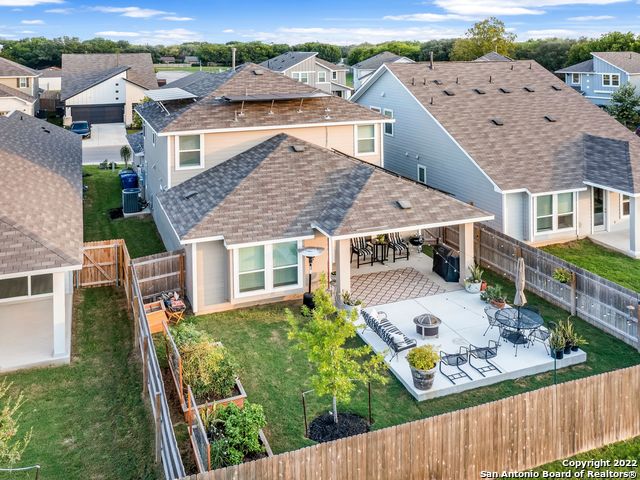 Newly priced below recent appraisal!! Solar panels allow for a fixed CPS bill each month! Exquisite upgrades including, luxury plank vinyl flooring throughout the downstairs, the stairs, and the bonus area. Kitchen highlights include upgraded cabinets with diamond cut pulls; Italian glass backsplash to the ceiling; De Vol brass shelf brackets with glass shelves; quartz counters and an under mount stainless sink. You will love the frameless glass shower and double vanity found in the master. You could have a party in the walk in closet! Upstairs is perfect for family with large bedrooms, storage and loft area. You will enjoy entertaining on your custom oversized patio with gas stub for future outdoor kitchen. Think about it! The home is also equipped with remote-controlled Bluetooth ceiling fans, ring doorbell, fiber internet and in wall pest control. Subdivision is just minutes from 1604 and easy access to 35. Just around the corner you can find everything you need at HEB. Upgrades, improvements and appraisal can be found in Docs.