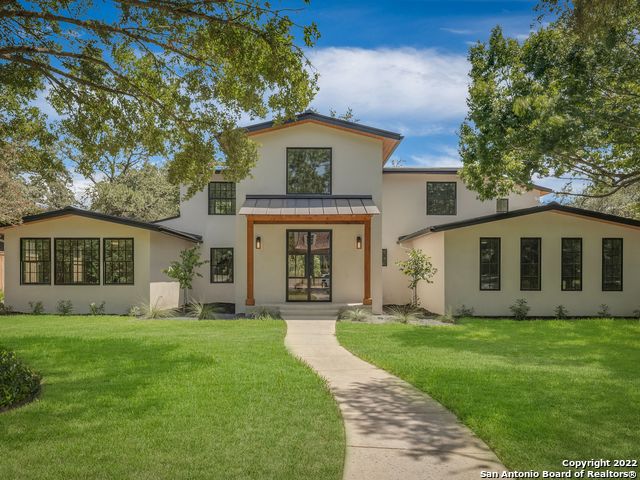 Prominently positioned within the prestigious community of Terrell Hills, this masterfully-designed estate is situated on nearly a half-acre of a lush, tree-filled lot. With over 5,600 square feet of living space, this gracious home features a flexible floor plan with seamless indoor and outdoor living, five bedrooms, five and a half bathrooms, and two bonus rooms that can be converted. Beyond the stately front doors, you are greeted by a grand foyer that flows into a spacious living area highlighted by a fireplace and into the dining area with beautiful outdoor views. The chef's kitchen is made with the entertainer in mind featuring Viking appliances, quartz countertops, an oversized island, and designer finishes while overlooking a second living area with a fireplace and upstairs access. The lower-level primary suite offers expansive outdoor views, French doors leading into an attached office or exercise room, and a spa-like bathroom with dual vanities, a soaking tub, an oversized walk-in shower, and two walk-in closets. The second level includes a media room, three secondary bedrooms, three full bathrooms, and additional workspace areas. Enjoy the outdoors under the covered patio with wood-paneled ceilings overlooking the spacious deck and backyard. The home is within close proximity to the San Antonio Country Club and the Alamo Heights schools.
