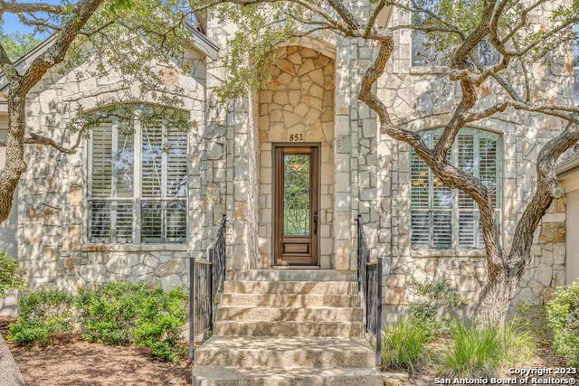Tucked away in this gated community is a quiet home of respite and relaxation. With less than 70 residences, Bent Tree is one of the most private enclaves in Stone Oak. This residence offers two large living areas and bedrooms, PLUS a separate study/office and bonus room! The heart of the home centers around a limestone fireplace in the kitchen and family room. Escape to the 1st floor primary suite with high tray ceilings, expansive windows and patio access. A spacious bath houses two walk-in closets, separate vanities, jetted tub and walk-in shower. The upstairs bedrooms open to a large bonus room. You'll love the attached three car garage and oversized laundry room (with dedicated space for a second fridge). Step outside into the fully fenced backyard; dappled with sun and shade, it offers plenty of space for a pool, if desired, along with a natural gas connection for grilling. Enjoy the Heights of Stone Oak's full amenities (Pool, Tennis, Soccer Field, etc) without the drive-by vehicular traffic.
