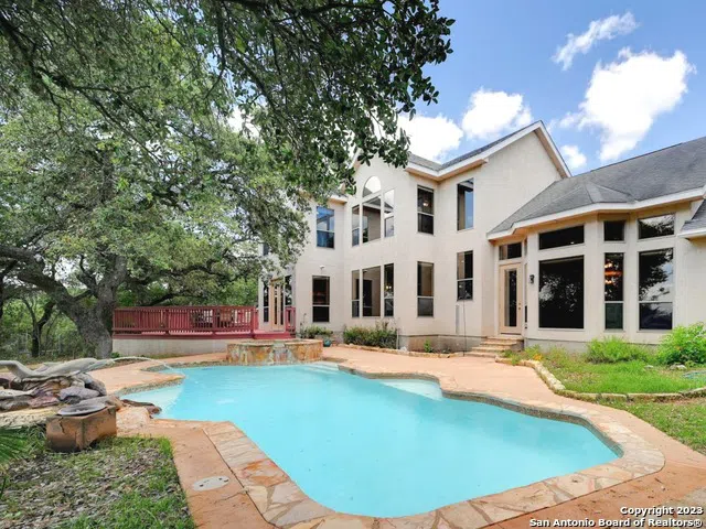 This stunning cul-de-sac property is one of the only horse properties in the sought-after neighborhood of Country Bend. Nested in the heart of over 3 acres of mature trees and a symphony of native plants, this home features a resort-style private backyard with in ground salt water pool/spa and waterfall, sheds, a barn, cross fencing, beautiful views and complete privacy. Offering 3 beds, 3 baths, 2 eating areas, 2 living areas, an exceptional built in bar with sitting area that opens to the spacious deck area via brand new French doors, this home offers endless possibilities for entertainment! The second floor features an office across from the master suite. The master suite is surrounded by stunning views of the Boerne Stage hills, and it includes an attached retreat/nursery/gym and an oversized master bathroom with walk-in shower, Venetian tub and travertine flooring throughout. The upstairs office could also be used as a fourth bedroom. Owned solar panels located in the lowest plane of the property generate enough power to sustain a large family's usage almost entirely. This property is zoned to the prestigious Boerne School District and its equidistant to everything Boerne has to offer as well as San Antonio, making it a perfect choice for those looking to get the best of both worlds! Only 10 minutes away from The Rim, La Cantera or Six Flags and 10 minutes from downtown Boerne. Come tour this property and make it your unrestricted space where you can truly experience the Hill Country living style. Price to sell, this home will not last!